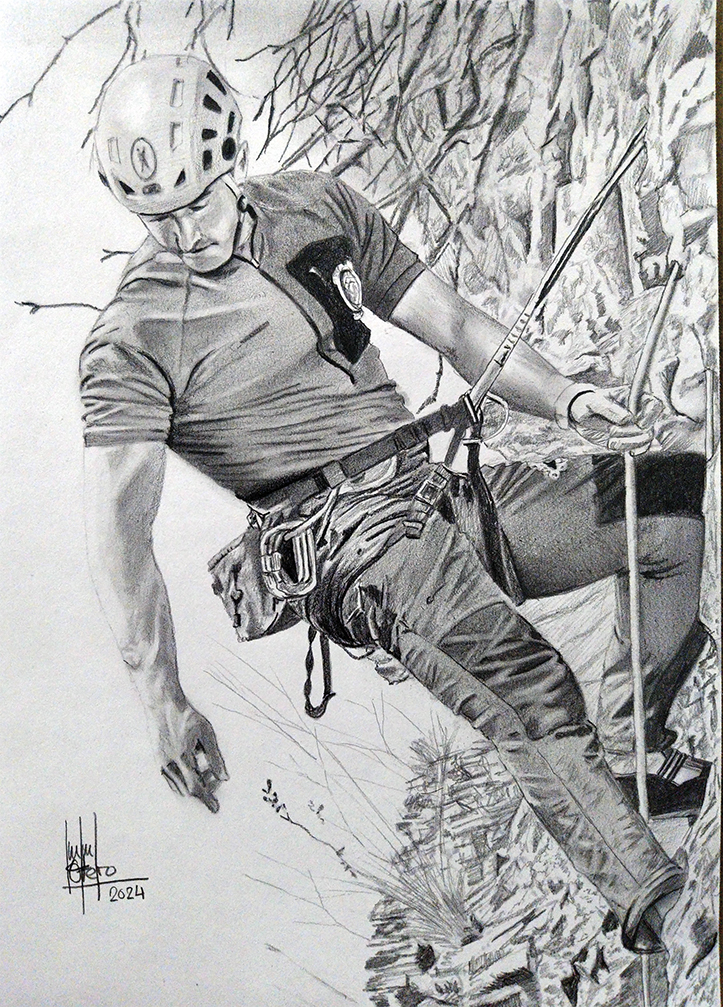 A través de técnicas de lápiz, carboncillo y color, Otero plasma escenas cotidianas, funciones y retratos que retratan la dedicación y sacrificio de sus integrantes, incluyendo a los guardias civiles retirados.